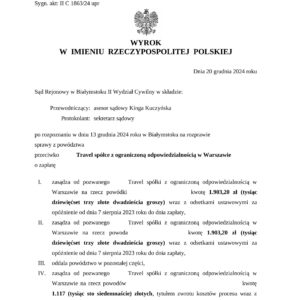 Reprezentując naszych Klientów w sporze z biurem podróży, udało się doprowadzić do zasądzenia przez Sąd odpowiedniego odszkodowania i zadośćuczynienia. Sprawa toczyła się przed Sądem Rejonowym w Białymstoku II Wydziałem Cywilnym.