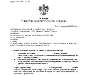 Wyrokiem z dnia 21.10.2024 r. Sąd Okręgowy w Szczecinie II Wydział Cywilny Odwoławczy zmienił wyrok Sądu I instancji. Orzekający Sąd zaakceptował argumentację zaprezentowaną przez naszych prawników i obciążył pozwanego obowiązkiem poniesienia kosztów procesu.